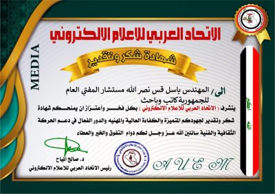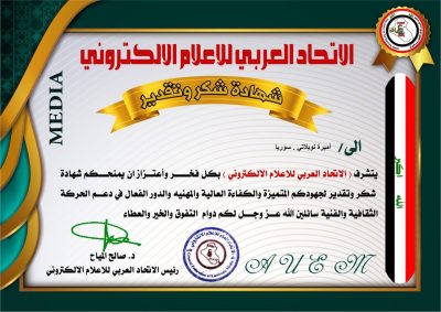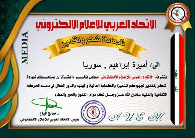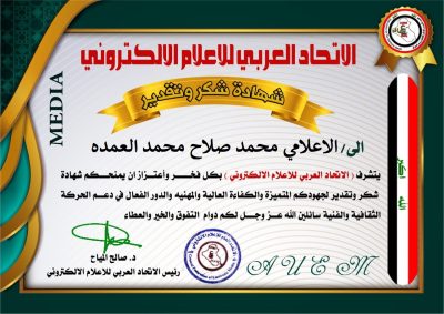 قرر الاتحاد العربي للأعلام الالكتروني تكريم السيدات والسادة الواردة اسمائهم في الشهادات التقديرية المدرجة ضمن مهرجان تكريم المبدعين السنوي والذي يقام سنويا في بغداد بمشاركة عربية واسعة وبحضور رسمي عراقي