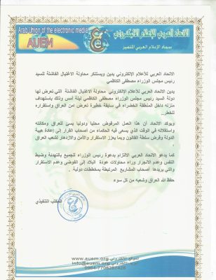 اصدر الاتحاد العربي للأعلام الإلكتروني بيان أدان فية محاولة الاغتيال الفاشلة التي تعرض لها رئيس الوزراء